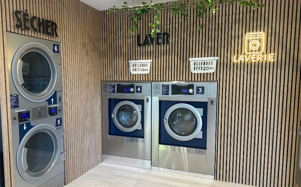 deux lave-linge de 6 kg pour le linge courant du quotidien, un lave-linge de 14 kg idéal pour les couettes, les serviettes ou les grosses lessives, ainsi que un lave-linge de 20 kg pour les volumes encore plus importants. L’espace est également équipé de deux sèche-linge, permettant un séchage rapide et efficace du linge.