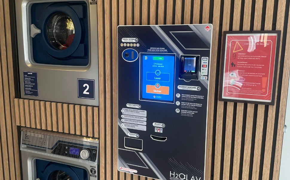 Pour encore plus de simplicité, la laverie propose une lessive en injection automatique gratuite. Les clients n’ont donc pas besoin d’apporter leur propre lessive pour lancer un programme. En complément, il est possible de sélectionner facilement des options supplémentaires comme l’adoucissant ou l’agent de blanchiment, directement depuis la centrale de paiement. Cette sélection a été pensée pour être simple, rapide et accessible à tous.